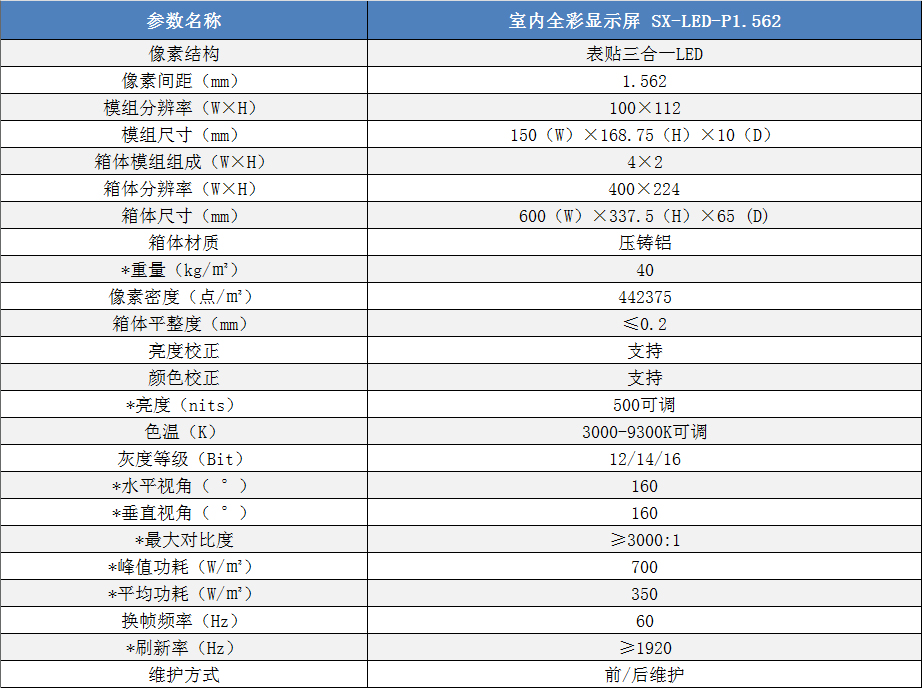 P1.562室內小間距高清全彩LED顯示屏技術參數: