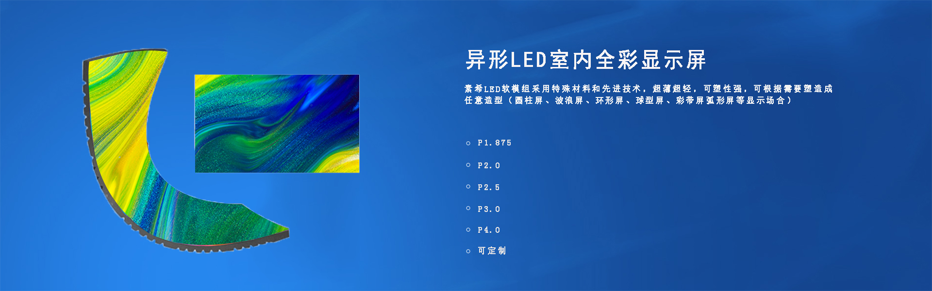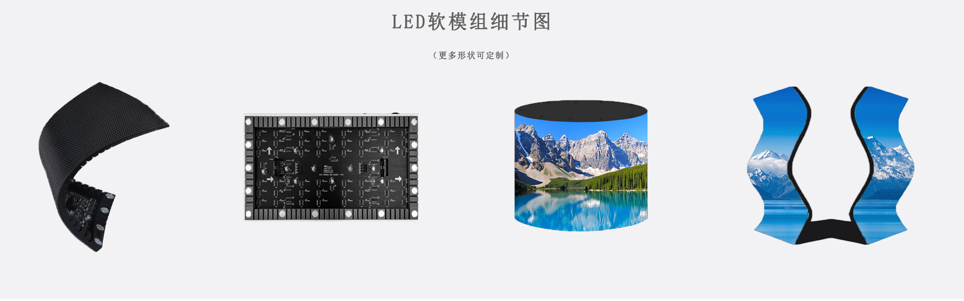 LED無縫拼接軟屏也稱作柔性LED顯示屏,軟模組、柔韌好、任意可彎曲,安裝可以是任意曲面,適合藝術造型;采用特殊材料和先進技術,超薄超輕,單個模組的厚度僅8mm,不僅輕薄,可塑性強,該系列LED軟模組屬于異形LED大屏,采用可彎曲pcb和硅膠底殼套件,柔韌性強,可彎曲弧度最高120°(適用于圓柱屏、波浪屏、環(huán)形屏、球型屏、彩帶屏弧形屏等顯示場合)